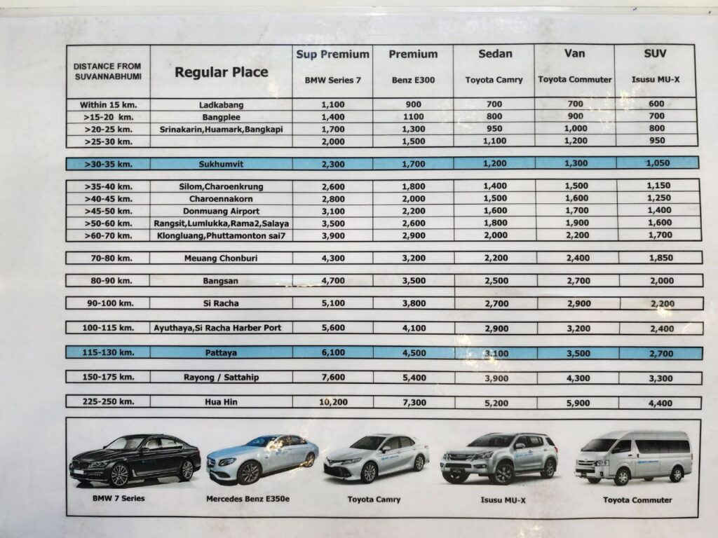 Here is the rate sheet from Suvarnabhumi Airport. If you plan on visiting other provinces first, this may be a convenient option for you.